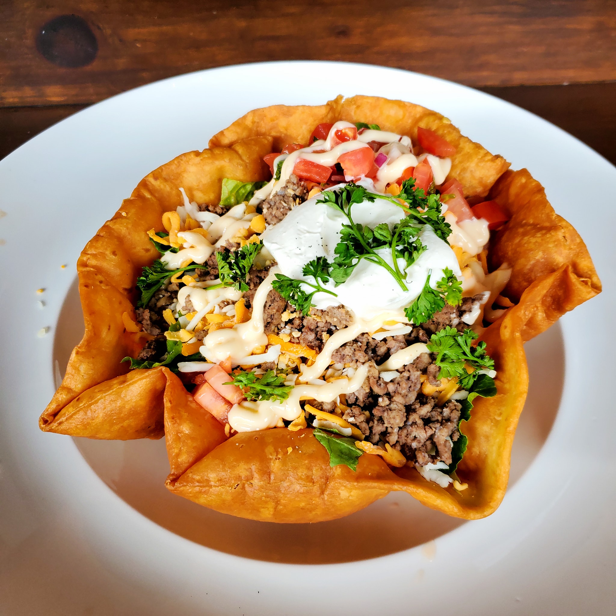 Lean Mexi-spiced ground beef, tomatoes, green onions & cheddar cheese topped with sour cream, salsa & cilantro.
