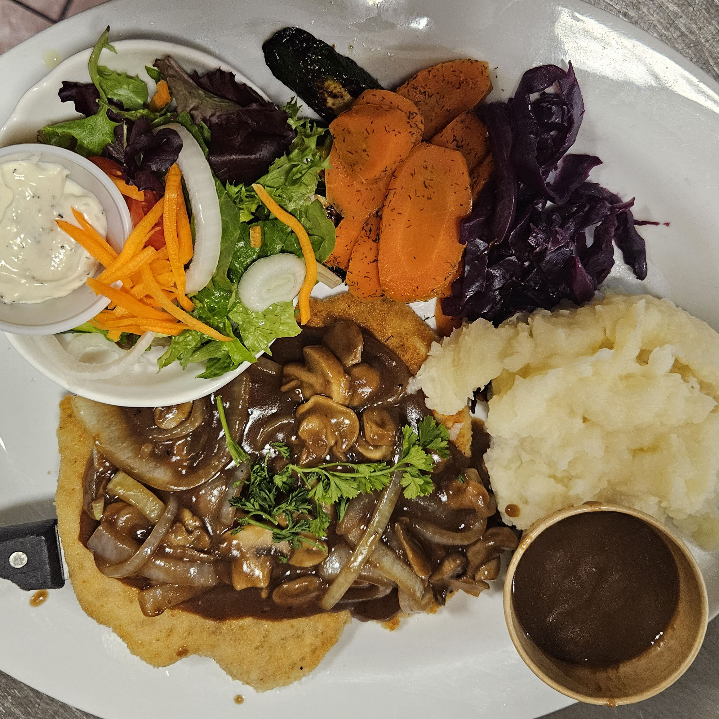 Lightly breaded with mushrooms, onions & garlic. Topped with a rich mushroom red wine gravy, and served on our mashed spuds.